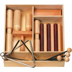 Klangstäbe - großes Tamburin - Triangel - Maracas - Schellenstab - Schellenarmbänder - Schellenkranz - Holzblock - Kastagnetten - Triangel